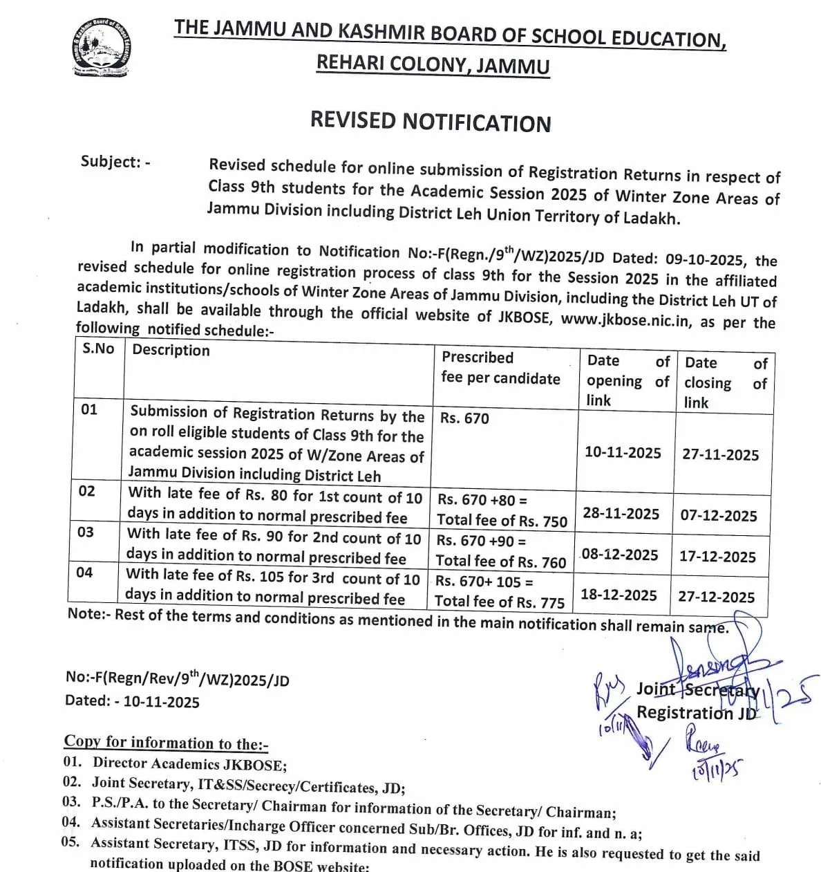 The Jammu and Kashmir Board of School Education – JKBOSE has issued a revised notification PDF for Class 9 Registration Returns for the Academic Session 2025. This notification is for Winter Zone Areas of Jammu Division which including District Leh and it brings changes to the registration timeline as announced earlier. The notification No. F(Regn/Rev/9th/WZ)/2025/JD published on 10 of November 2025 which was previously published on 09 October 2025. Students can now registered themselves on official website of JKBOSE www.jkbose.nic.in This revised dates gives more time to institutions and students.